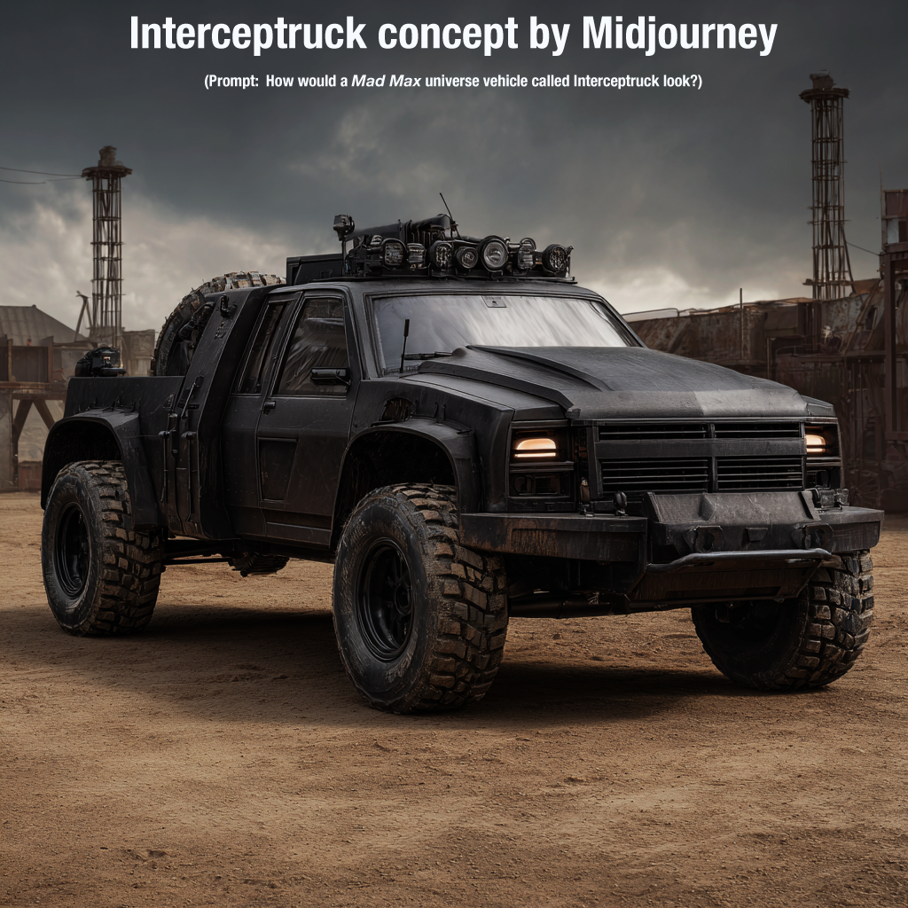 I’ve always been a huge fan of the Mad Max films. My first thought when I saw the truck at the dealership was, “this has a strong Mad Max chic æsthetic.” So, after some soul-searching and about 5 minutes of careful consideration, I decided to name the new vehicle The Interceptruck. Interceptruck fits the naming conventions and styling of vehicles in the Mad Max universe, especially as a play on “Interceptor,” Max Rockatansky’s iconic police muscle car, and “truck,” suiting a heavier, pursuit-oriented vehicle. It aligns with the universe’s blend of function-driven, evocative names for hybrid vehicles.